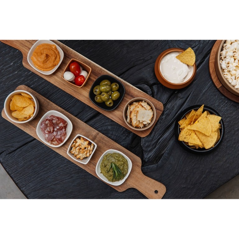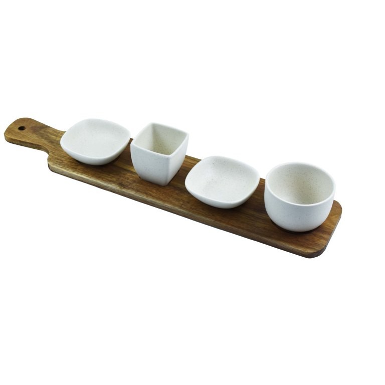 Deze serveerset bestaat uit een acaciahouten serveerplank met vier keramieken schaaltjes. Perfect voor het serveren van snacks, dips of tapas. Dankzij de handige inkepingen blijven de schaaltjes stevig op hun plek en verschuiven ze niet bij het optillen van de plank.De schaaltjes zijn vaatwasser bestendig.