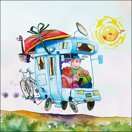 Marius van Dokkum. Freewheelen – Opa Jan, dubbele wenskaart, 12x12cm, met bijpassende enveloppe en in cellofaan verpakt.