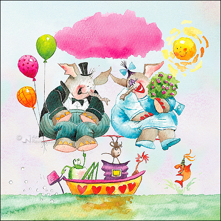 Marius van Dokkum. Huwelijksbootje – Opa Jan, dubbele wenskaart, 12x12cm, met bijpassende enveloppe en in cellofaan verpakt.