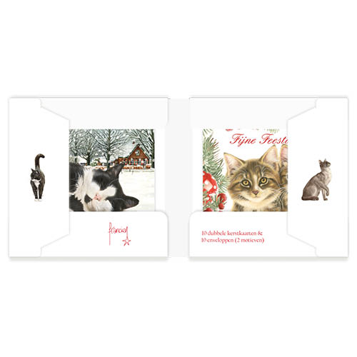 Kerstkaarten doosje van Franciens katten met 10 (dubbele) wenskaarten en 10 enveloppen. De kaarten zijn 11,5 x 11,5 cm. De kerstkaarten zijn leverbaar vanaf september.