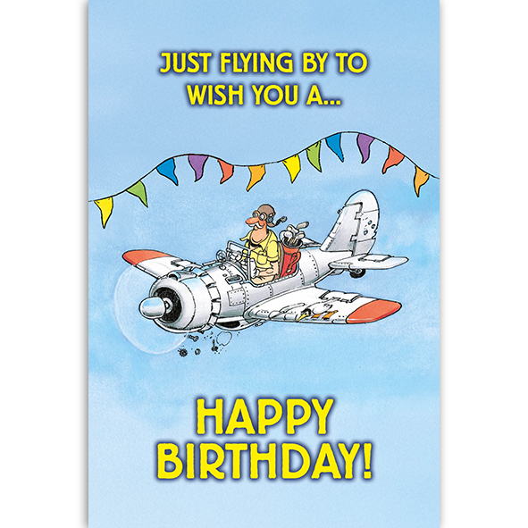 Jan van Haasteren dubbele kaart, 11,3 x 17 cm met envelop in cellofaan. Tekst: Just flying by to wish you a happy birthday!