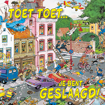 Jan van Haasteren dubbele kaart, 13,5 x 13,5 cm met envelop in cellofaan, Toet Toet, je bent geslaagd!