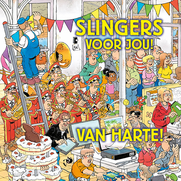 Jan van Haasteren dubbele kaart, 13,5 x 13,5 cm met envelop in cellofaan. Tekst: Slingers voor jou!