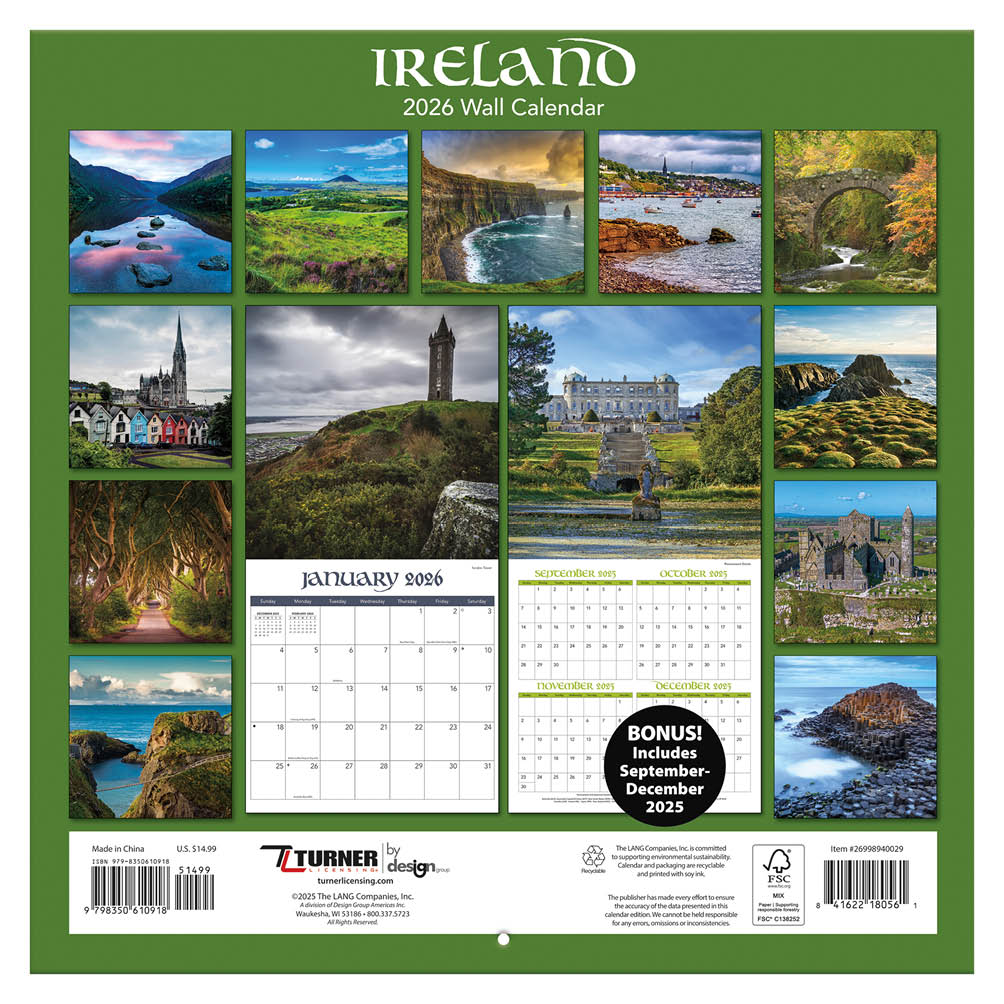 Ireland kalender. De Ireland Kalender is gemaakt van glanspapier en start in september en heeft vanaf januari t/m december een grote foto van de Ireland daar onder de beschikbare data van de maand met ruimte voor persoonlijke notities en verjaardagen. Een aantal belangrijke (school)vakanties en feestdagen zijn alvast toegevoegd op de kalender. De teksten op de Ireland 16 maanden kalender is bedrukt in het Engels.Uitgeklapt is de kalender ca. 30 x 60 cm met bovenaan de afbeelding en daaronder de data van de maand. De kalender is aan de bovenkant voorzien van een gaatje waardoor u de kalender eenvoudig kunt ophangen aan een haakje of spijker. Bijvoorbeeld in de keuken, kantoor of het toilet. Wandkalender met foto’s van de Ireland De kalender heeft in totaal 13 verschillende full-color afbeeldingen van 30 x 30 cm (1 full-color afbeelding bij de data van de maanden oktober, november en december). Hierdoor kunt u de kalender al voor nieuwjaar een mooi plekje geven. Vanaf het nieuwe jaar heeft de wandkalender iedere maand een andere prachtige full-color afbeelding.