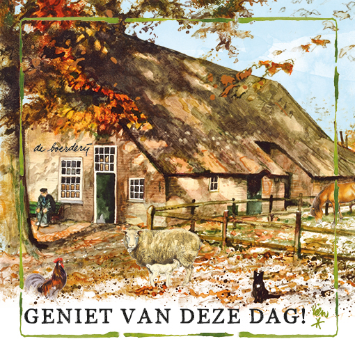 Rien Poortvliet, Lang Leve de boederij serie. Dubbele kaart 13,5×13,5 cm met envelop in cellofaan, Geniet van deze dag!