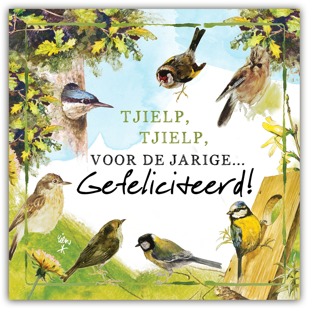 Rien Poortvliet, Lang Leve de boederij serie. Dubbele kaart 13,5×13,5 cm met envelop in cellofaan, Tjielp, tjielp, voor de jarige… Gefeliciteerd!