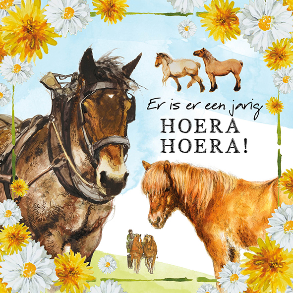 Rien Poortvliet, Lang Leve de boederij serie. Dubbele kaart 13,5 x 13,5 cm met envelop in cellofaan. Tekst: Er is er een jarig HOERA HOERA!