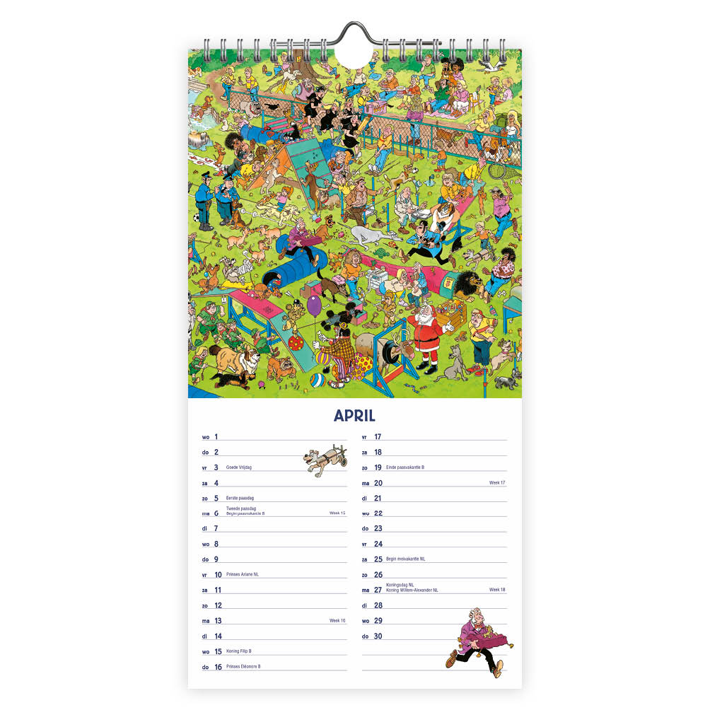 Vrolijke maandnotitiekalender van Jan van Haasteren. Deze kalender biedt veel notitieruimte en is uiteraard voorzien van alle feest- en vakantiedagen van Nederland en België. Vind jij de kleine plaatjes onderin terug in de grote plaat?