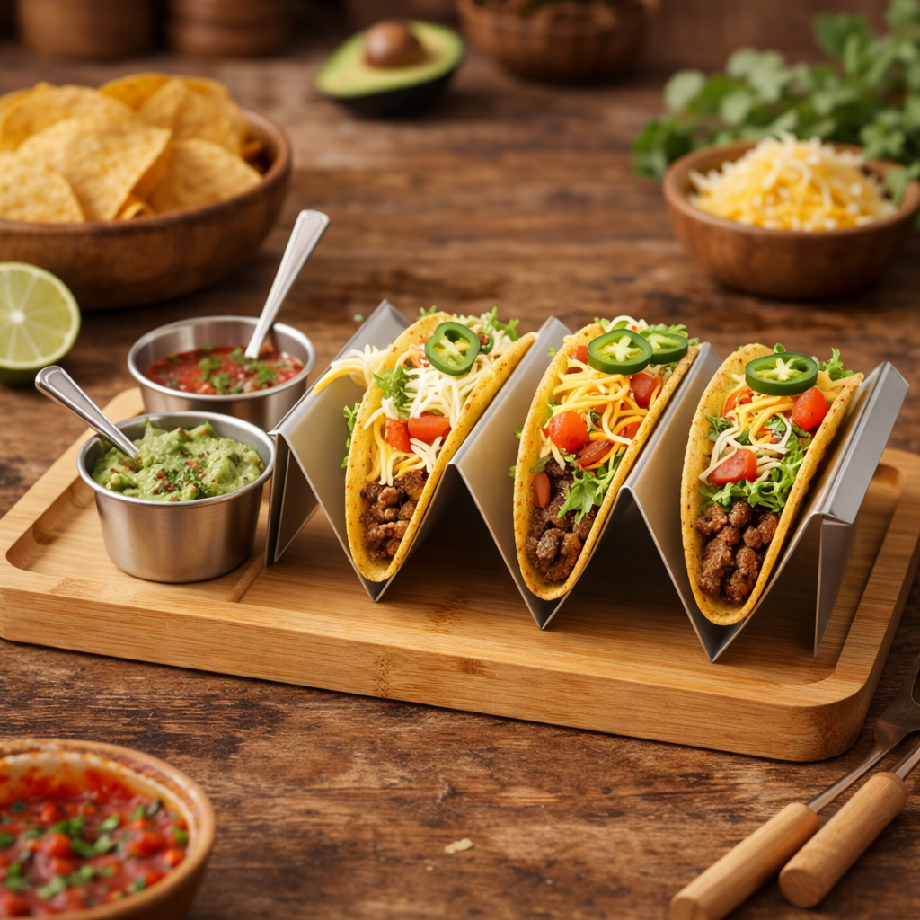 Deze serveerset brengt de gezelligheid van streetfood rechtstreeks naar je eettafel. De set bestaat uit een bamboe plank met een metalen taco houder, waarmee je o.a. taco’s stevig en overzichtelijk presenteert. Twee kleine metalen schaaltjes bieden ruimte voor salsa, saus of andere toppings. Perfect voor een feestelijke avond met vrienden of een kleurrijk diner thuis.